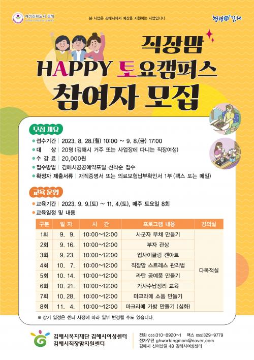 [½Åµ¿¾Æ¹æ¼Û´º½º=ÃÖ¼ÛÈ­±âÀÚ] (Àç)±èÇØ½Ãº¹ÁöÀç´Ü ±èÇØ½Ã¿©¼º¼¾ÅÍ(Á÷À帾Áö¿ø¼¾ÅÍ)¿¡¼­´Â ¹Ù»Û ÀÏ»ó¿¡ ÁöÄ£ Á÷À帾À» À§ÇØ ÁÖ¸»À» ÀÌ¿ëÇÏ¿© ÀÚ±â°è¹ß ½Ã°£À» °®°í ´Ù¾çÇÑ Ä¿¸®Å§·³ÀÇ 8ÁÖ°£ Ư°­À» ÁغñÇÏ¿© ¡ºHAPPY Åä¿äÄ·ÆÛ½º¡»Âü¿©ÀÚ¸¦ ¸ðÁýÇÑ´Ù. À̹ø ¡ºHAPPY Åä¿ä¡¦