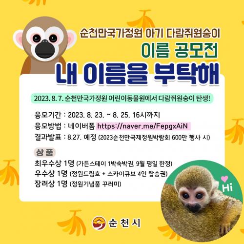 [½Åµ¿¾Æ¹æ¼Û=±è¿ëÈÆ ±âÀÚ] ¼øÃµ½Ã(½ÃÀå ³ë°ü±Ô)°¡ Áö³­ 7ÀÏ 2023¼øÃµ¸¸±¹Á¦Á¤¿ø¹Ú¶÷ȸ ±â°£¿¡ ±¹°¡Á¤¿ø µ¿¹°¿ø¿¡¼­ ž ¾Æ±â ´Ù¶÷Áã¿ø¼þÀÌ À̸§À» °ø¸ðÇÑ´Ù. ½Ã´Â ¾î¸°À̵¿¹°¿ø »õ ½Ä±¸°¡ µÈ ´Ù¶÷Áã¿ø¼þÀÌÀÇ Ãâ»êÀ̶ó´Â ±âºÐ ÁÁÀº ¼Ò½ÄÀ» ¿©·¯ »ç¶÷°ú ÇÔ²²Çϱâ À§¡¦