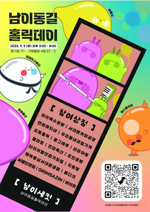 ¼­´ë¹®±¸ ³²°¡Á»ýȰ»ó±Ç ÃßÁøÀ§¿øÈ¸´Â »ýȰ»ó±Ç °ñ¸ñ Ȱ¼ºÈ­¿Í ³²À̵¿±æ ºê·£µå °¡Ä¡¸¦ È®»êÇϱâ À§ÇØ 9¿ù 9ÀÏ ¿ÀÈÄ 3½ÃºÎÅÍ 8½Ã±îÁö ¡®Á¦3ȸ ³²À̵¿±æ Ȧ¸¯µ¥ÀÌ ºê·£µå ÃàÁ¦¡¯¸¦ °³ÃÖÇÑ´Ù°í ¹àÇû´Ù. À̹ø ºê·£µå ÃàÁ¦´Â ¡®³²À̵¿±æ Ȧ¸¯µ¥ÀÌ, ¾î¸ÞÀÌ¡ ³²À̵¿±æ¡¯ÀÌ¡¦