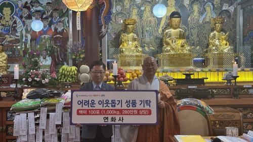 [½Åµ¿¾Æ¹æ¼Û´º½º=ÃÖ¼ÛÈ­±âÀÚ] ±èÇØ½Ã´Â 30ÀÏ µ¿»óµ¿¿¡ ÀÖ´Â »çÂû ¿¬È­»ç¿¡¼­ Ãß¼®À» ¾ÕµÎ°í ÀÌ¿ôµ½±â ¼ºÇ°À¸·Î ½Ò 1,000kg(280¸¸¿ø »ó´ç)À» ±âŹÇß´Ù°í ¹àÇû´Ù. ±âŹ ½ÒÀº ±èÇØ½ÃÁ¾ÇÕ»çȸº¹Áö°ü Ǫµå¸¶Äϰú ±èÇØ½ÃÀÚ¿øºÀ»ç´ÜüÇùÀÇȸ »ç¶ûÀÇ ½Ò³ª´®ÀºÇà¿¡ º¸³»Á® ¾î¡¦