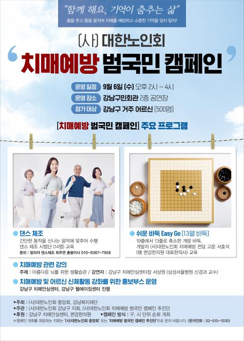 [½Åµ¿¾Æ¹æ¼Û °­³²=À̽ŵ¿±âÀÚ]°­³²±¸°¡ Ä¡¸Å ±Øº¹ÀÇ ³¯(9¿ù 21ÀÏ)À» ¸Â¾Æ ¿À´Â 6ÀÏ ¿ÀÈÄ 2½Ã °­³²±¸¹Îȸ°ü¿¡¼­ ¾î¸£½Å 500¸í°ú ÇÔ²² Ä¡¸Å¿¹¹æ ¹ü±¹¹Î Ä·ÆäÀÎÀ» ½Ç½ÃÇÑ´Ù. (»ç)´ëÇѳëÀÎȸ°¡ ÁÖÃÖÇÏ°í °­³²±¸Ä¡¸Å¾È½É¼¾ÅͰ¡ ÈÄ¿øÇÏ´Â À̹ø Çà»ç´Â Ä¡¸Å¿¹¹æ°ú Àνݳ¼±¡¦