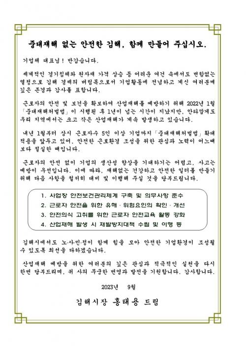 [½Åµ¿¾Æ¹æ¼Û´º½º=ÃÖ¼ÛÈ­±âÀÚ] ±èÇØ½Ã(½ÃÀå ȫſë)´Â ³»³âºÎÅÍ È®´ë Àû¿ëµÇ´Â Áß´ëÀçÇØÃ³¹ú¹ý¿¡ ´ëºñÇØ °ü³» ±â¾÷ü¿¡ ¼­Çѹ®À» ¹ß¼ÛÇß´Ù°í 5ÀÏ ¹àÇû´Ù. À̹ø ¼­Çѹ®Àº ±Ù·ÎÀÚ 50¸í ÀÌ»óÀÇ »ç¾÷À常 Àû¿ëµÇ¾ú´ø Áß´ëÀçÇØÃ³¹ú¹ýÀÌ ³»³â 1¿ù 27ÀϺÎÅÍ ±Ù·ÎÀÚ 5ÀÎ ÀÌ»ó¡¦