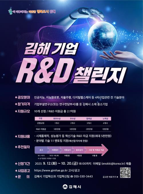 [½Åµ¿¾Æ¹æ¼Û´º½º=ÃÖ¼ÛÈ­±âÀÚ] ±èÇØ½Ã´Â ±â¾÷ÀÇ ÀÚ¹ßÀû ±â¼úÇõ½Å ¿¬±¸°³¹ß(R&D) Ȱµ¿À» ÃËÁøÇÏ°í ¹Ì·¡¼ºÀ嵿·ÂÀ» È®º¸Çϱâ À§ÇØ 12ÀϺÎÅÍ ´ÙÀ½´Þ 20ÀϱîÁö ¡®±èÇØ ±â¾÷ R&D 縰Áö¡¯ Âü¿©±â¾÷À» ¸ðÁýÇÑ´Ù. ¿ÃÇØ óÀ½ °³ÃÖÇÏ´Â ¡®±èÇØ ±â¾÷ R&D 縰Áö¡¯´Â ÀΰøÁö´É, ¡¦