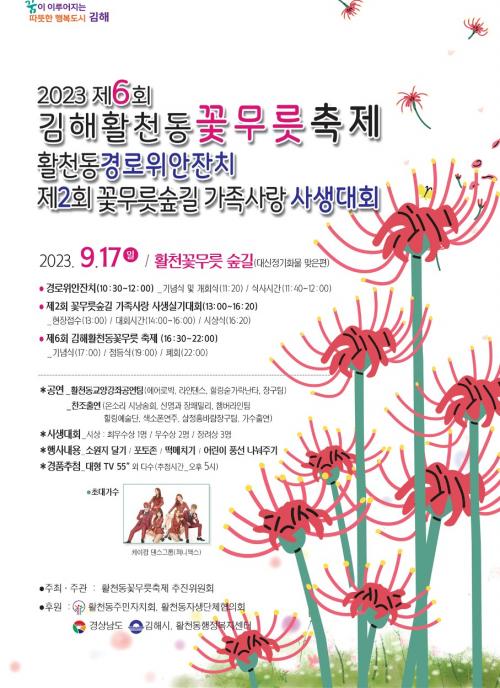 [½Åµ¿¾Æ¹æ¼Û´º½º=ÃÖ¼ÛÈ­±âÀÚ] ¸Å³â 9~10¿ù¿¡ ¸¸°³ÇÏ´Â ²É¹«¸©°ú ÇÔ²² ¡°Á¦6ȸ ±èÇØ Ȱõ²É¹«¸© ÃàÁ¦¡±°¡ 9¿ù 17ÀÏ(ÀÏ) Ȱõ ²É¹«¸© ½£±æ(¾î¹æµ¿ 1073¹øÁö)¿¡¼­ °³ÃֵȴÙ. ¡°È°Ãµ ²É¹«¸© ½£±æ¡±Àº Ȱõµ¿ ÁÖ¹ÎÀÚġȸ¿Í ÀÚ»ý´Üü, ÀÚ¿øºÀ»çÀÚµéÀÌ 48,000§³¿¡ À̸£´Â ³ì¡¦