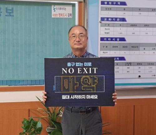 [½Åµ¿¾Æ¹æ¼Û´º½º=ÃÖ¼ÛÈ­±âÀÚ] ±èÈ£¿µ µ¿»óµ¿ÀåÀÌ ¸¶¾à Áßµ¶ÀÇ À§Ç輺À» ¾Ë¸®°í °æ°¢½ÉÀ» °íÃëÇØ ¸¶¾à ¹üÁ˸¦ ¿¹¹æÇϰíÀÚ ÇÏ´Â ³ë ¿¢½ÃÆ®(NO EXIT) Ä·ÆäÀο¡ µ¿ÂüÇß½À´Ï´Ù. ¡®Ãⱸ¾ø´Â ¹Ì·Î(NO EXIT) ¸¶¾à! Àý´ë ½ÃÀÛÇÏÁö ¸¶¼¼¿ä!¡¯¶ó°í ÀûÈù ÆÖ¸»À» µç »çÁøÀ» SNS¡¦