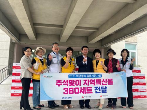 [½Åµ¿¾Æ¹æ¼Û=¹Ú±¤¿Á±âÀÚ] ±¤¾ç½Ã´Â 14ÀÏ ´ëÇÑÀû½ÊÀÚ»ç ±¤ÁÖ¡¤Àü³²Áö»ç(ȸÀå ÇãÁ¤)°¡ Ãß¼®À» ¸Â¾Æ Áö¿ª ³» Ãë¾à°èÃþ 360°¡±¸¿¡ Áö¿ªÆ¯»ê¹° ¼¼Æ®¸¦ Àü´ÞÇß´Ù°í ¹àÇû´Ù. Ãß¼®¸ÂÀÌ Áö¿ªÆ¯»ê¹° ¼¼Æ® Àü´ÞÀº »ï¼º¿¡¼­ ÈÄ¿øÇØ Èñ¸ÁdzÂ÷ ¹°Ç°Áö¿ø»ç¾÷À¸·Î ÃßÁøµÆ´Ù. ÈÄ¿ø ¹°¡¦