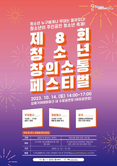 [½Åµ¿¾Æ¹æ¼Û´º½º=ÃÖ¼ÛÈ­±âÀÚ] ±èÇØ½Ã´Â ³»´Þ 14ÀÏ 14½ÃºÎÅÍ, °¡¾ßÅ׸¶ÆÄÅ© ¼ö·Î°ø¿¬Àå¿¡¼­ Á¦8ȸ û¼Ò³ââÀǼÒÅëÆä½ºÆ¼¹úÀÌ ¿­¸°´Ù°í ¹àÇû´Ù. 2023 ±èÇØ½Ã û¼Ò³â ¾î¿ï¸²¸¶´ç(¿¬6ȸ) 4ȸÂ÷·Î ÁøÇàµÉ À̹ø Çà»ç´Â ¿©¼º°¡Á·ºÎ, °æ»ó³²µµ, ±èÇØ½Ã°¡ ÁÖÃÖÇÏ°í ±èÇØÃ»¼Ò¡¦