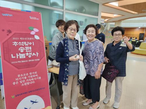 [½Åµ¿¾Æ¹æ¼Û´º½º=ÃÖ¼ÛÈ­±âÀÚ] (Àç)±èÇØ½Ãº¹ÁöÀç´Ü(´ëÇ¥ÀÌ»ç ÃÖÁ¤±Ô) ±èÇØ½Ã³ëÀÎÁ¾ÇÕº¹Áö°üÀº 9¿ù 26ÀÏ(È­), ¹ÎÁ· °íÀ¯ÀÇ ´ë¸íÀýÀÎ Ãß¼®À» ¸ÂÀÌÇÏ¿© º¹Áö°ü ÀÌ¿ë¾î¸£½Å 200¿©¸í°ú ÇÔ²² ¼ÛÆí³ª´® Çà»ç¸¦ ÁøÇàÇÏ¿´´Ù. ±ÝÀÏ Çà»ç´Â º¹Áö°ü ÀÌ¿ëÀÚµé°ú ÇÔ²² ¼ÛÆíÀ» ºúÀ¸¡¦