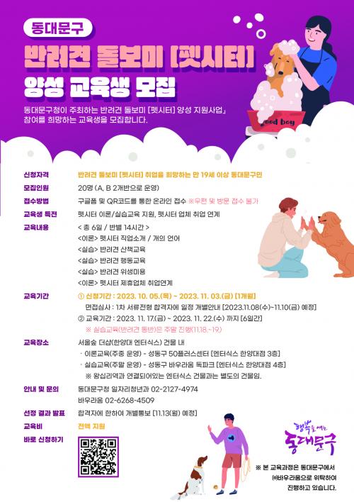 µ¿´ë¹®±¸(±¸Ã»Àå ÀÌÇÊÇü)°¡ 10¿ù 5ÀÏ(¸ñ)ºÎÅÍ 11¿ù 3ÀÏ(±Ý)±îÁö ¡®¹Ý·Á°ß µ¹º¸¹Ì(Æê½ÃÅÍ) ¾ç¼º ±³À°°úÁ¤¡¯ Âü¿©ÀÚ¸¦ ¸ðÁýÇÑ´Ù. ¡®Æê½ÃÅÍ¡¯¶õ ¿©Çà, ÃâÀå µîÀÇ ÀÌÀ¯·Î ¹Ý·ÁÀÎÀÌ ÁýÀ» ºñ¿ï ¶§ ¿äûÇÑ ½Ã°£ µ¿¾È ¹Ý·Áµ¿¹°À» ´ë½Å µ¹ºÁÁÖ´Â Àü¹® Á÷¾÷ÀÎÀ¸·Î, ±¸´Â ¹Ý·Áµ¿¡¦