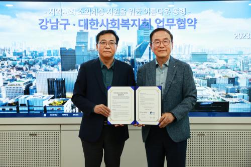 [½Åµ¿¾Æ¹æ¼Û °­³²=À̽ŵ¿±âÀÚ]°­³²±¸°¡ 17ÀÏ ¿ÀÈÄ 3½Ã ±¸Ã»¿¡¼­ ´ëÇÑ»çȸº¹Áöȸ(ȸÀå °­´ë¼º)¿Í Áö¿ª»çȸ ¼Ò¿Ü°èÃþ Áö¿øÀ» À§ÇÑ ¾÷¹«Çù¾àÀ» ü°áÇß´Ù. °ü³» º»È¸°¡ ÀÖ´Â ´ëÇÑ»çȸº¹Áöȸ´Â 1954³â ¼³¸³µÈ »çȸº¹Áö¹ýÀÎÀÌ´Ù. ÇöÀç º»È¸ ¹× 3°³ »ç¹«¼Ò, 24°³ ½Ã¼³À» ¿î¿µ¡¦