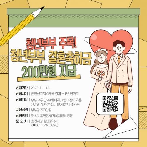 [½Åµ¿¾Æ¹æ¼Û=±è¿ëÈÆ ±âÀÚ] ¼øÃµ½Ã(½ÃÀå ³ë°ü±Ô)´Â û³â ¼¼´ëÀÇ °áÈ¥ ÃʱâÀÇ °æÁ¦Àû ºÎ´ãÀ» ÁÙÀÌ°í ¾ÈÁ¤ÀûÀÎ Áö¿ª Á¤ÂøÀ» À§ÇØ ½ÅÈ¥ºÎºÎ´ç °áÈ¥ÃàÇÏ±Ý 200¸¸ ¿øÀ» Áö±ÞÇϰí ÀÖ´Ù°í ¹àÇû´Ù. ½ÅûÀÚ°ÝÀº 2022. 1. 1. ÀÌÈÄ È¥ÀνŰíÇÑ ¸¸ 49¼¼ ÀÌÇÏÀÇ ºÎºÎ·Î, ºÎºÎ Áß ÇÑ¡¦