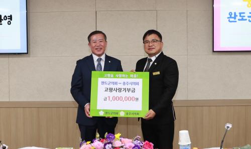 [½Åµ¿¾Æ¹æ¼Û=À̼±Á¾ ±âÀÚ] ¿Ïµµ±ºÀÇȸ(ÀÇÀå Çã±ÃÈñ)°¡ ÃæºÏ ÃæÁÖ½ÃÀÇȸ(ÀÇÀå ¹ÚÇØ¼ö)°¡ µÎ Áö¿ª °øµ¿¹ßÀü°ú ¿ìÈ£Çù·ÂÀ» ´ÙÁ®°¡±â À§ÇØ °íÇâ»ç¶û±âºÎ±ÝÀ» °¢°¢ ±âŹÇϱâ·Î Çß´Ù. À̹ø Çà»ç´Â ¿ÃÇØ 3¿ù ¿Ïµµ±ºÀÇȸ¿Í ÃæÁÖ½ÃÀÇȸ°¡ µµ¼­¿Í ³»·úÀÇ ±³·ùÈ®´ë ¹× ¡¦