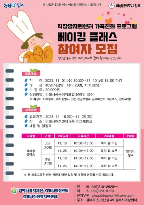 [½Åµ¿¾Æ¹æ¼Û´º½º=ÃÖ¼ÛÈ­±âÀÚ] (Àç)±èÇØ½Ãº¹ÁöÀç´Ü ±èÇØ½ÃÁ÷À帾Áö¿ø¼¾ÅÍ´Â Á÷À帾¡¤´ëµð(ÀÚ³à) ´ë»óÀ¸·Î 11¿ù 18ÀÏ(Åä) ~ 11¿ù 25ÀÏ(Åä) ±îÁö Á÷À帾 °¡Á·Ä£È­ ÇÁ·Î±×·¥ ¡ºº£ÀÌÅ· Ŭ·¡½º¡»¸¦ ¿î¿µÇÑ´Ù. º» ÇÁ·Î±×·¥ Á¢¼ö´Â ±èÇØ½Ã°ø°ø¿¹¾àÆ÷ÅÐ ´©¸® Áý¿¡¼­ Á¢¼öÇϸç,¡¦