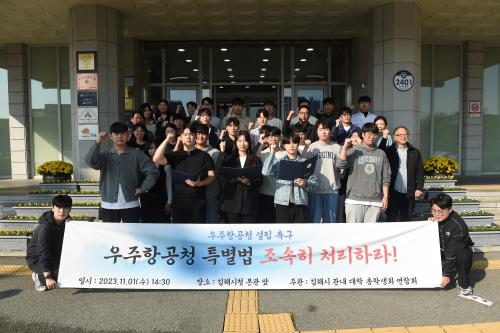 [½Åµ¿¾Æ¹æ¼Û´º½º=ÃÖ¼ÛÈ­±âÀÚ] °æ³²Áö¿ª ´ëÇлýµéÀÌ ¿ìÁÖÇ×°øÃ» Ưº°¹ý Á¦Á¤À» Ã˱¸ÇÏ°í ³ª¼± °¡¿îµ¥, ±èÇØ½Ã °ü³» 3°³ ´ëÇÐ(°¡¾ß´ë, ±èÇØ´ë, ÀÎÁ¦´ë)ÀÇ ÃÑÇлýȸ ¿¬ÇÕȸ´Â 1ÀÏ ±èÇØ½Ãû º»°ü ¾Õ¿¡¼­ ±âÀÚȸ°ßÀ» ¿­°í, ±¹È¸´Â ¡®¿ìÁÖÇ×°øÃ» ¼³Ä¡ ¹× ¿î¿µ¿¡ °üÇÑ Æ¯º°¹ý¡¯¡¦