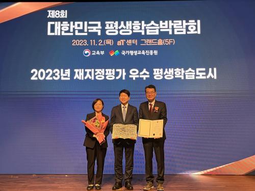 [½Åµ¿¾Æ¹æ¼Û °­³²=À̽ŵ¿±âÀÚ]°­³²±¸°¡ ±³À°ºÎ¿¡¼­ ÁÖÃÖÇÏ´Â Æò»ýÇнÀµµ½Ã ÀçÁöÁ¤ Æò°¡¸¦ Åë°úÇÏ°í ¿ì¼öÆò»ýÇнÀµµ½Ã·Î ¼±Á¤µÅ Áö³­ 2ÀÏ ¡®Á¦8ȸ ´ëÇѹα¹ Æò»ýÇнÀ¹Ú¶÷ȸ¡¯¿¡¼­ ±³À°ºÎÀå°ü ǥâÀ» ¼ö¿©Çß´Ù. ±³À°ºÎ´Â Æò»ý±³À°¹ý 15Á¶¿¡ ÀǰŠÆò»ýÇнÀµµ½Ã¸¦ ÁöÁ¤ÇÏ¡¦