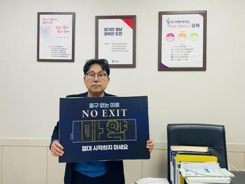[½Åµ¿¾Æ¹æ¼Û´º½º=±èÁÖ¿¬±âÀÚ] ±èÀç¿ë ±èÇØ½Ã ÀåÀ¯2µ¿ÀåÀÌ ¸¶¾à ¹üÁË ¿¹¹æÀ» À§ÇÑ ¡®NO EXIT¡¯ Ä·ÆäÀο¡ Âü¿©Çß´Ù°í 17ÀÏ ¹àÇû´Ù. ³ë ¿¢½ÃÆ®(NO EXIT) Ä·ÆäÀÎÀº ¸¶¾àÀÇ À§Ç輺°ú ¾Ë¸®°í °æ°¢½ÉÀ» ³ôÀ̰íÀÚ °æÂûû°ú ¸¶¾àÅðÄ¡¿îµ¿º»ºÎ°¡ Áö³­ 4¿ùºÎÅÍ °øµ¿À¸·Î ÃßÁøÇÏ¡¦