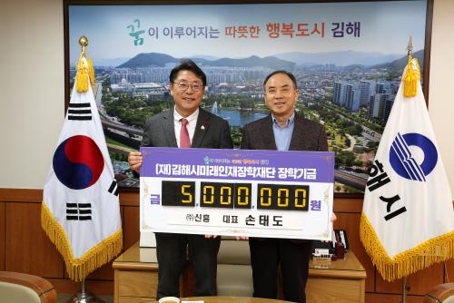 [½Åµ¿¾Æ¹æ¼Û´º½º=ÃÖ¼ÛÈ­±âÀÚ] ±èÇØ½Ã¹Ì·¡ÀÎÀçÀåÇÐÀç´Ü(ÀÌ»çÀå ÇöÁ¾¿ø)Àº 6ÀÏ ¢ß½ÅÈï(´ëÇ¥ÀÌ»ç ¼Õŵµ)¿¡¼­ ÀåÇбâ±Ý 500¸¸¿øÀ» ±âºÎÇß´Ù°í ¹àÇû´Ù. ±èÇØ½Ã ÇѸ²¸é¿¡ À§Ä¡ÇÑ ¢ß½ÅÈïÀº 1946³â ¼³¸³ ÀÌÈÄ 70¿© ³â°£ ¸ñÀç ÆÈ·¹Æ®, ¹Ú½º Á¦ÀÛ°ú ¼öÃâ Æ÷Àå¿¡ Á¾»çÇØ¿Â ´ëÇÑ¡¦