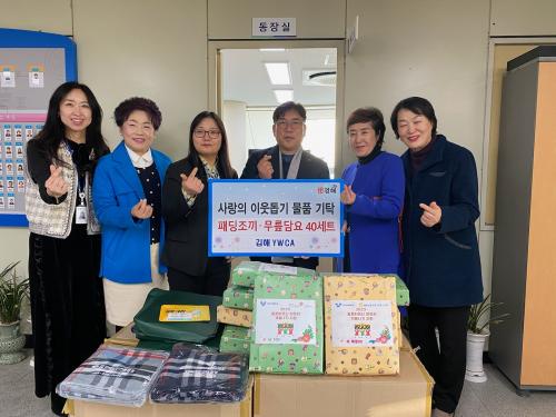 [½Åµ¿¾Æ¹æ¼Û´º½º=ÃÖ¼ÛÈ­±âÀÚ] ºÏºÎµ¿¿¡ ¼ÒÀçÇÑ ±èÇØYWCA(ȸÀå ±èÇýÁø)´Â Áö³­ 13ÀÏ, ºÏºÎµ¿ÇàÁ¤º¹Áö¼¾Å͸¦ ¹æ¹®ÇØ µ¶°Å¾î¸£½Å¿¡°Ô Àü´ÞÇØ ´Þ¶ó¸ç ÆÐµùÁ¶³¢ 40¹ú, ¹«¸­´ã¿ä 40°³¸¦ ±âŹÇß´Ù. À̹ø ±âŹÇÑ ¹°Ç°Àº ±èÇØYWCA¿¡¼­ Áö³­ 10¿ù ¡®ÀÏÀÏ Ä«ÆäÅ׸®¾Æ¡¯ Çà»ç¸¦ ¿î¡¦