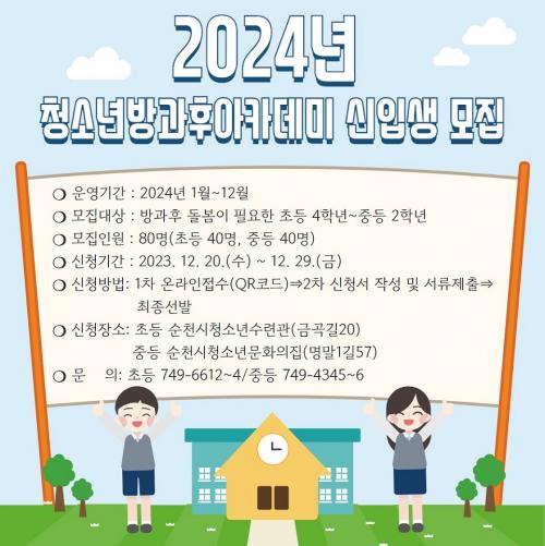[½Åµ¿¾Æ¹æ¼Û ¼øÃµ=±è¿ëÈÆ ±âÀÚ] ¼øÃµ½Ã(½ÃÀå ³ë°ü±Ô)´Â ¿À´Â 20ÀϺÎÅÍ 29ÀϱîÁö 2024³â û¼Ò³â¹æ°úÈľÆÄ«µ¥¹Ì ½ÅÀÔ»ý 80¸íÀ» ¸ðÁýÇÑ´Ù. ´ë»óÀº Áö¿ª ³»¿¡¼­ ¹æ°ú ÈÄ µ¹º½ÀÌ ÇÊ¿äÇÑ ÃʵîÇб³ 4~6Çгâ 40¸í(û¼Ò³â¼ö·Ã°ü)°ú ÁßÇб³ 1~2Çгâ 40¸í(û¼Ò³â¹®È­ÀÇÁý)À̸ç,¡¦