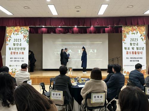 [½Åµ¿¾Æ¹æ¼Û ÇÔ¾È=À̽ŵ¿±âÀÚ]ÇԾȱº û¼Ò³â»ó´ãº¹Áö¼¾ÅÍ¿Í Çб³¹Ûû¼Ò³âÁö¿ø¼¾ÅÍ(¼¾ÅÍÀå ¹èÇöÁÖ)´Â Áö³­ 15ÀÏ ÇԾȱºÃ»¼Ò³â¼ö·Ã°ü¿¡¼­ û¼Ò³â¾ÈÀü¸Á ¿î¿µº¸°íȸ ¹× Çб³ ¹Û û¼Ò³â Á¹¾÷½ÄÀ» °³ÃÖÇß´Ù°í ¹àÇû´Ù. »ó´ãº¹Áö¼¾ÅÍÀÇ Ã»¼Ò³â¾ÈÀü¸Á ¿î¿µº¸°íȸ´Â °ü³» À§¡¦