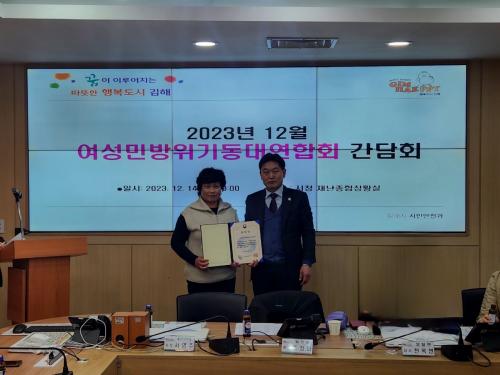 [½Åµ¿¾Æ¹æ¼Û´º½º=±èÁÖ¿¬±âÀÚ] ±èÇØ½Ã ¿©¼º¹Î¹æÀ§±âµ¿´ë¿¬ÇÕȸ(ȸÀå ¼­¿µÁÖ)°¡ Áö³­ 14ÀÏ ±èÇØ½Ãû Àç³­Á¾ÇÕ»óȲ½Ç¿¡¼­ ¿­¸° ¡®2023³âµµ 12¿ù ¿©¼º¹Î¹æÀ§±âµ¿´ë¿¬ÇÕȸ °£´ãȸ¡¯¿¡¼­ ¹Î¹æÀ§¾÷¹«¹ßÀüÀ¯°ø ǥâ(ÈÆ°Ý : ÇàÁ¤¾ÈÀüºÎÀå°ü)À» ¼ö»óÇß´Ù. Áö³­ 2008³â â¼³µÈ¡¦