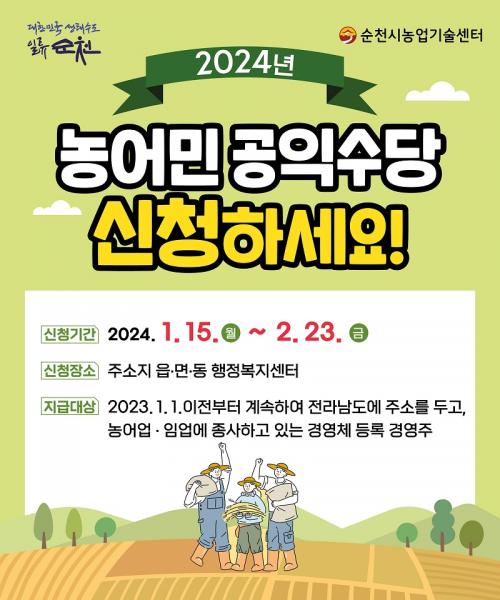 [½Åµ¿¾Æ¹æ¼Û ¼øÃµ=±è¿ëÈÆ ±âÀÚ] ¼øÃµ½Ã(½ÃÀå ³ë°ü±Ô)´Â ¿À´Â 15ÀϺÎÅÍ 2¿ù 23ÀϱîÁö ¡®2024³â ³ó¾î¹Î °øÀͼö´ç¡¯½ÅûÀ» ÁÖ¼ÒÁö °üÇÒ À¾¸éµ¿ ÇàÁ¤º¹Áö¼¾ÅÍ¿¡¼­ Á¢¼öÇÑ´Ù°í ¹àÇû´Ù. ¡®³ó¾î¹Î °øÀͼö´ç¡¯Àº ³ó¾î¹Î¡¤ÀÓ¾÷ÀÎ »îÀÇ Áú Çâ»ó°ú ³ó¾î¾÷¡¤³ó¾îÃÌÀÇ Áö¼Ó °¡´ÉÇÑ¡¦