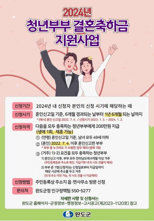[½Åµ¿¾Æ¹æ¼Û=¿Ïµµ À̼±Á¾ ±âÀÚ] ¿Ïµµ±ºÀº û³âÃþÀÇ °áÈ¥ Ãʱ⠰æÁ¦Àû ºÎ´ã ¿ÏÈ­¿Í ¾ÈÁ¤ÀûÀÎ Áö¿ª Á¤ÂøÀ» µ½°íÀÚ ¡®2024³â û³â ºÎºÎ °áÈ¥ÃàÇϱݡ¯À» 200¸¸ ¿ø Áö¿øÇÑ´Ù. ½Åû ÀÚ°ÝÀº 2022³â 7¿ù 4ÀÏ ÀÌÈÄ È¥ÀÎ½Å°í¸¦ ÇÑ ºÎºÎ·Î, È¥ÀνŰíÀÏ ±âÁØ 49¼¼ ÀÌÇÏÀÇ ºÎ¡¦