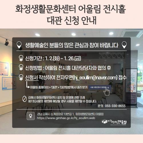 [½Åµ¿¾Æ¹æ¼Û´º½º=±èÁÖ¿¬±âÀÚ] ±èÇØ½Ã È­Á¤»ýȰ¹®È­¼¾ÅÍ ¾î¿ï¸²(ÀÌÇÏ ¾î¿ï¸²)Àº 2024³âµµ Àü½ÃȦ ´ë°ü ½ÅûÀ» ¹Þ´Â´Ù°í 12ÀÏ ¹àÇû´Ù. ´ë°üÀº ¿À´Â 2¿ùºÎÅÍ 12¿ù Áß ¼¾ÅÍ ÀÚü ±âȹÀü½Ã¸¦ Á¦¿ÜÇÑ ±â°£ÀÌ¸ç ¿À´Â 26ÀϱîÁö Áö¿ªÀÇ ¼ø¼ö ¿¹¼ú °³Àΰú ´Üü¸¦ ´ë»óÀ¸·Î ¼±¡¦