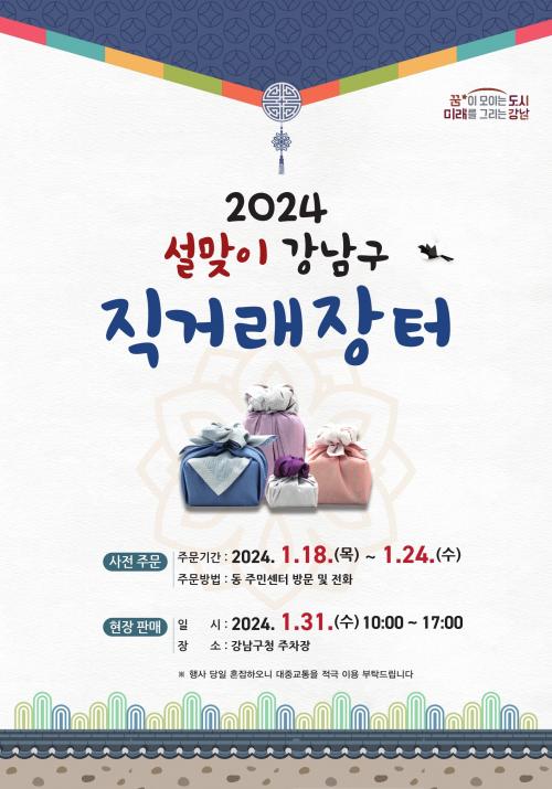 [½Åµ¿¾Æ¹æ¼Û °­³²=À̽ŵ¿±âÀÚ]°­³²±¸(±¸Ã»Àå Á¶¼º¸í)°¡ ¼³ ¸íÀýÀ» ¸Â¾Æ ¿À´Â 1¿ù 31ÀÏ 10½ÃºÎÅÍ 17½Ã±îÁö ±¸Ã» ÁÖÂ÷Àå¿¡¼­ ¡®¼³¸ÂÀÌ ³óÃà¼ö»ê¹° Á÷°Å·¡ ÀåÅÍ¡¯¸¦ ¿¬´Ù. Àü±¹ 50¿©°÷ 80¿©°³ ³ó°¡°¡ Âü¼®ÇÏ´Â ÀåÅÍ´Â Çѿ졤¹è¡¤»ç°ú µî ¸íÀý Á¦¼ö¿ëǰ°ú ±¼ºñ¡¤¹ö¼¸ µî¡¦