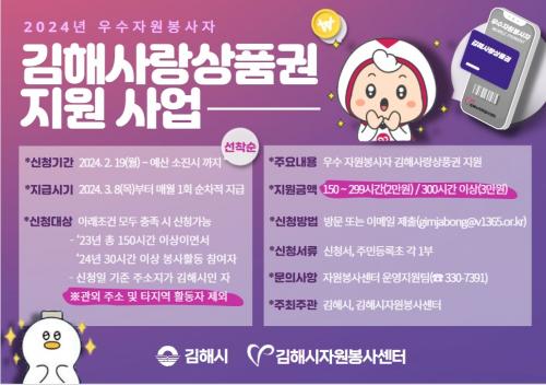 [½Åµ¿¾Æ¹æ¼Û´º½º=ÃÖ¼ÛÈ­±âÀÚ] ±èÇØ½Ã¿Í ±èÇØ½ÃÀÚ¿øºÀ»ç¼¾ÅÍ´Â ÀÚ¿øºÀ»ç µ¿±â ºÎ¿©¸¦ À§ÇÑ ¿ì¼ö ÀÚ¿øºÀ»çÀÚ ±èÇØ»ç¶û»óǰ±Ç Áö¿ø»ç¾÷À» ÃßÁøÇÑ´Ù°í 13ÀÏ ¹àÇû´Ù. 2022³â ½Ã¹ü»ç¾÷À¸·Î ½ÃÀÛÇØ ¿ÃÇØ´Â ¿À´Â 19ÀϺÎÅÍ ¼±Âø¼øÀ¸·Î ½ÅûÀ» ¹Þ´Â´Ù. ½Åû ±âÁØÀº 2023³â ÇÑ ÇØ¡¦