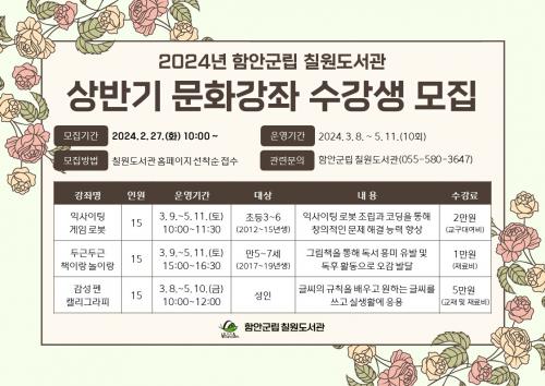 ÇԾȱº¸³ Ä¥¿øµµ¼­°ü, 2024³â »ó¹Ý±â ¹®È­°­Á ¼ö°­»ý ¸ðÁý