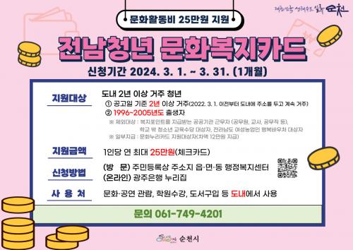 [½Åµ¿¾Æ¹æ¼Û ¼øÃµ=±è¿ëÈÆ ±âÀÚ] ¼øÃµ½Ã(½ÃÀå ³ë°ü±Ô)°¡ û³âÀ» ´ë»óÀ¸·Î ¹®È­»ýȰ ÇâÀ¯ ¹× ÀÚ±â°è¹ß µî ¹®È­È°µ¿ºñ Áö¿øÀ» À§ÇØ 2024³â Àü³²Ã»³â ¹®È­º¹ÁöÄ«µå Áö¿ø»ç¾÷ ´ë»óÀÚ¸¦ 3¿ù ÇÑ ´Þ°£ ¸ðÁýÇÑ´Ù. Àü³²Ã»³â ¹®È­º¹ÁöÄ«µå´Â ¼øÃµ½Ã¿¡ °ÅÁÖÇϴ û³â¿¡°Ô °ø¿¬°ü¶÷¡¦