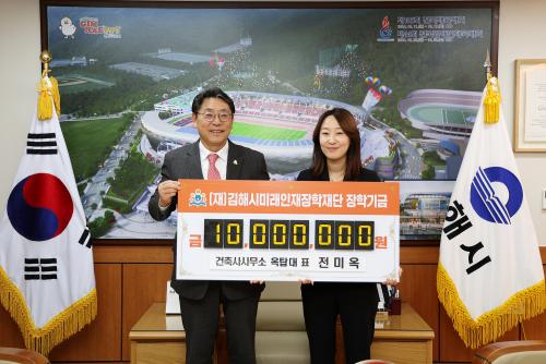 [½Åµ¿¾Æ¹æ¼Û´º½º=ÃÖ¼ÛÈ­±âÀÚ] ±èÇØ½Ã¹Ì·¡ÀÎÀçÀåÇÐÀç´Ü(ÀÌ»çÀå ÇöÁ¾¿ø)Àº Áö³­ 21ÀÏ °ÇÃà»ç»ç¹«¼Ò ¿Áž(´ëÇ¥ Àü¹Ì¿Á)¿¡¼­ ÀåÇбâ±Ý 1,000¸¸¿øÀ» ±âŹÇß´Ù°í 22ÀÏ ¹àÇû´Ù. ±èÇØ½Ã ºÎ¿øµ¿¿¡ À§Ä¡ÇÑ °ÇÃà»ç»ç¹«¼Ò ¿ÁžÀº 2020³â °³¼³ÇÑ °ÇÃ༳°è¿Í °¨¸®°¡ ÁÖ ¾÷¹«ÀÎ °ÇÃࡦ