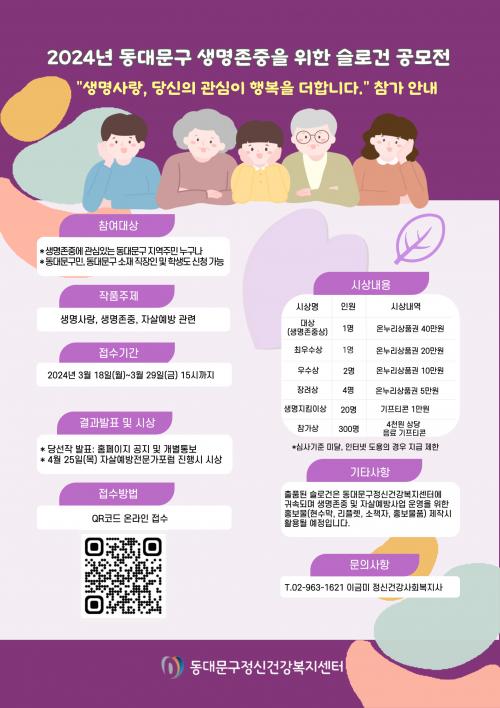 [½Åµ¿¾Æ¹æ¼Û µ¿´ë¹®=À̽ŵ¿±âÀÚ]¼­¿ï µ¿´ë¹®±¸°¡ Áö¿ªÁÖ¹ÎÀÇ Àڻ쿹¹æ Àνݳ¼± ¹× »ý¸íÁ¸Áß ¹®È­ È®»êÀ» À§ÇØ ¡®2024³â µ¿´ë¹®±¸ »ý¸íÁ¸ÁßÀ» À§ÇÑ ½½·Î°Ç °ø¸ðÀü¡¯À» °³ÃÖÇÑ´Ù. À̹ø °ø¸ðÀüÀº »ý¸íÁ¸Áß¿¡ °ü½ÉÀÌ ÀÖ´Â ±¸¹Î ´©±¸³ª Âü¿© °¡´ÉÇϸç, µ¿´ë¹®±¸ ¼ÒÀç Á÷À塦