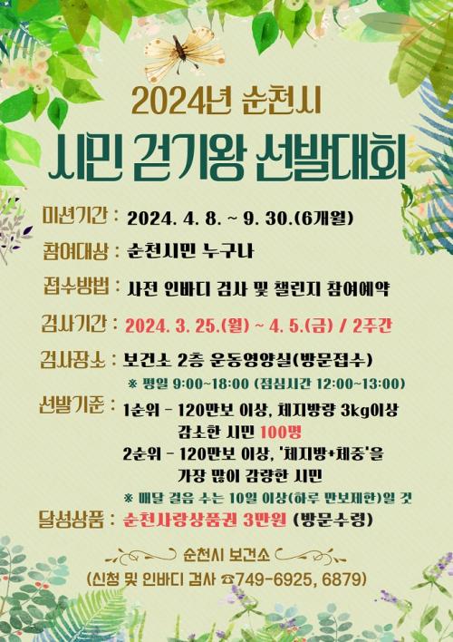 [½Åµ¿¾Æ¹æ¼Û ¼øÃµ=±è¿ëÈÆ ±âÀÚ] ¼øÃµ½Ã(½ÃÀå ³ë°ü±Ô)´Â ÀÏ»ó»ýȰ ¼Ó °È±â Ȱ¼ºÈ­ ÇÁ·ÎÁ§Æ®ÀÇ ÀÏȯÀ¸·Î ¿À´Â 4¿ù 5ÀϱîÁö ½Ã¹Î °È±â¿Õ ¼±¹ß´ëȸ¿¡ Âü¿©ÇÒ ¼øÃµ½Ã¹ÎÀ» ¸ðÁýÇÑ´Ù°í ¹àÇû´Ù. À̹ø ´ëȸ´Â 4¿ùºÎÅÍ 9¿ù±îÁö 6°³¿ù°£¿¡ °ÉÃÄ ¸ð¹ÙÀÏ °È±â¾Û(¿öÅ©¿Â)À» ÅëÇØ ½Ç¡¦