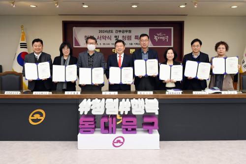 [½Åµ¿¾Æ¹æ¼Û µ¿´ë¹®=À̽ŵ¿±âÀÚ]¼­¿ï µ¿´ë¹®±¸°¡ ¹ÝºÎÆÐ¡¤Ã»·ÅÀÇ½Ä È®»êÀ» À§ÇØ 20ÀÏ ¿ÀÀü 5±Þ ÀÌ»ó °£ºÎ °ø¹«¿ø 60¿© ¸íÀÌ Âü¼®ÇÑ °¡¿îµ¥ û·Å¼­¾à½Ä°ú û·ÅƯ°­À» °³ÃÖÇß´Ù. ±¸´Â °íÀ§°øÁ÷ÀÚ°¡ ¼Ö¼±¼ö¹üÇϴ û·ÅÇÑ Á¶Á÷¹®È­¸¦ Á¶¼ºÇϱâ À§ÇØ ±â°üÀÇ ¸®´õ·Î¼­ »ç¸í¡¦