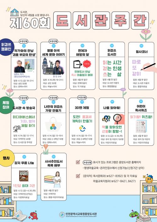 [½Åµ¿¾Æ¹æ¼Û ÀÎõ=À±¹Î½Ä±âÀÚ]ÀÎõ±¤¿ª½Ã±³À°Ã»Áß¾Óµµ¼­°ü(°üÀå Á¤°æ¾Ö)Àº Á¦2ȸ µµ¼­°üÀÇ ³¯(4¿ù 12ÀÏ)°ú Á¦60ȸ µµ¼­°üÁÖ°£(4¿ù 12ÀÏ-18ÀÏ)À» ±â³äÇØ 4¿ù ÇÑ ´Þ°£ ´Ùä·Î¿î Çà»ç¸¦ ¿î¿µÇÑ´Ù. Çà»ç´Â ÀаȾ² Ä·ÆäÀÎÀ» Áß½ÉÀ¸·Î ÀÛ°¡¿ÍÀÇ ¸¸³²,¼¼°è ¹®È­ Ư°­,¿¬Ã¼ÀÚ¡¦
