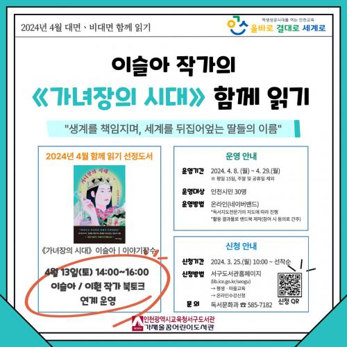 [½Åµ¿¾Æ¹æ¼Û ÀÎõ=À±¹Î½Ä±âÀÚ]ÀÎõ±¤¿ª½Ã±³À°Ã»¼­±¸µµ¼­°üÀº ¡¸´ë¸é¡¤ºñ´ë¸é ÇÔ²² Àб⡹ 4¿ù ÇÁ·Î±×·¥À¸·Î À̽½¾Æ ÀÛ°¡ÀÇ ¡®°¡³àÀåÀÇ ½Ã´ë¡¯ ÇÔ²² Àб⸦ ¿î¿µÇÑ´Ù°í 25ÀÏ ¹àÇû´Ù. ¡¸´ë¸é¡¤ºñ´ë¸é ÇÔ²² Àб⡹´Â ÀÎõ½Ã¹ÎÀ» ´ë»óÀ¸·Î ¿ùº°·Î ÁöÁ¤µÈ µµ¼­¸¦ ÇÔ²² ÀС¦