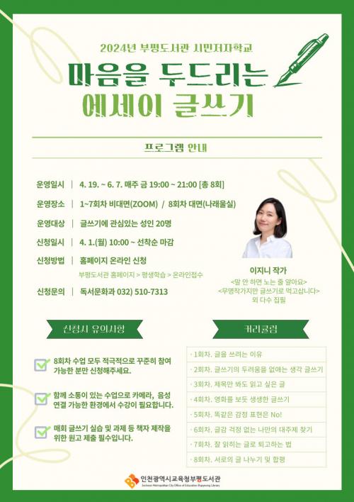 [½Åµ¿¾Æ¹æ¼Û ÀÎõ=À±¹Î½Ä±âÀÚ]ÀÎõ±¤¿ª½Ã±³À°Ã»ºÎÆòµµ¼­°ü °üÀå ±èÀ翵Àº ÀÛ°¡¿Í ÇÔ²²ÇÏ´Â ¡¸¸¶À½À» µÎµå¸®´Â ¿¡¼¼ÀÌ ±Û¾²±â¡¹ Âü¿©ÀÚ¸¦ 4¿ù 1ÀÏ ¿ÀÀü 10½ÃºÎÅÍ È¨ÆäÀÌÁö¿¡¼­ ¼±Âø¼ø ¸ðÁýÇÑ´Ù. ¡®¸¶À½À» µÎµå¸®´Â ¿¡¼¼ÀÌ ±Û¾²±â¡¯´Â ¸ÅÀÏ ²ÙÁØÈ÷ ±ÛÀ» ¾µ ¼ö ÀÖµµ·Ï ¡¦