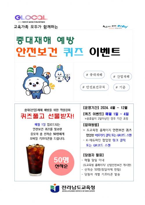 [½Åµ¿¾Æ¹æ¼Û Àü³²¿©¼ö=À̽ŵ¿±âÀÚ]Àü¶ó³²µµ±³À°Ã»ÀÌ ±¸¼º¿øµéÀÇ ¾ÈÀüº¸°Ç Áö½ÄÀ» ³ôÀÏ ¼ö ÀÖ´Â ¡®Áß´ëÀçÇØ ¿¹¹æ ¾ÈÀüº¸°Ç ÄûÁî À̺¥Æ®¡¯¸¦ ÁøÇàÇÑ´Ù. À̺¥Æ®´Â 4¿ùºÎÅÍ 12¿ù±îÁö ¿î¿µÇϸç, ¸Å¿ù 1 ~ 4ÀÏ »çÀÌ ÀÀ¸ðÇÒ ¼ö ÀÖ´Ù. ÄûÁî ³»¿ëÀº Áß´ëÀçÇØÃ³¹ú¹ý ÁÖ¿ä ³»¿ë°ú¡¦