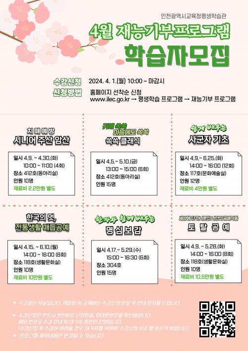 ÀÎõ±¤¿ª½Ã±³À°Ã»Æò»ýÇнÀ°ü, 4¿ù Àç´É±âºÎ ÇÁ·Î±×·¥ ÇнÀÀÚ ¸ðÁý