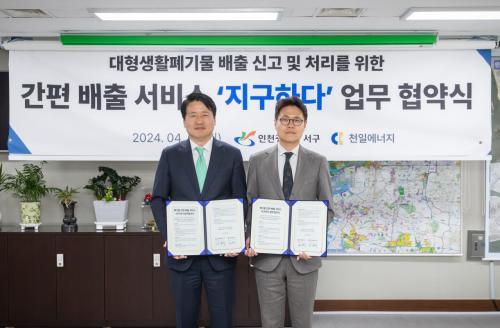 [½Åµ¿¾Æ¹æ¼Û ÀÎõ=À±¹Î½Ä±âÀÚ]ÀÎõ ¼­±¸´Â ´ëÇüÆó±â¹°ÀÇ Æí¸®ÇÑ ¹èÃâ°ú ºü¸¥ ¼ö°Å¸¦ À§ÇØ ¡®¾îÇà Áö±¸ÇÏ´Ù¡¯ ¿î¿µ»çÀÎ ¢ßõÀÏ¿¡³ÊÁö¿Í ¾÷¹«Çù¾àÀ» ü°áÇß´Ù°í ¹àÇû´Ù. ´ëÇüÆó±â¹°À̶õ Á¾·®Á¦ºÀÅõ¿¡ ´ã¾Æ ¹èÃâÇϱ⠾î·Á¿î ħ´ë, Àå·Õ, ÀÇÀÚ, °Å¿ï µîÀ¸·Î Á¾·®Á¦ºÀÅõ¡¦