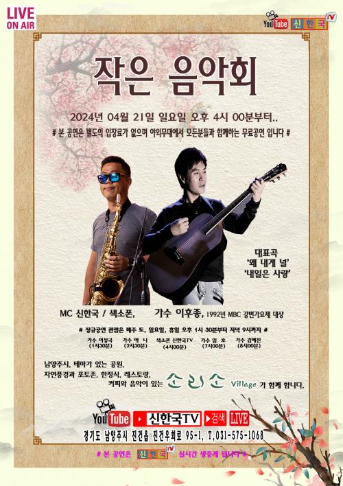 [½Åµ¿¾Æ¹æ¼Û = ½Å°æ½Ä ±âÀÚ] ½ÅÇѱ¹TV´Â 2024³â 4¿ù 21ÀÏ ÀÏ¿äÀÏ ¿ÀÈÄ 4½ÃºÎÅÍ °æ±âµµ ³²¾çÁֽà Áø°ÇÀ¾ÀÇ Å׸¶°ø¿ø ¼Ò¸®¼Òºô¸®Áö ¾ß¿Ü °ø¿¬Àå¿¡¼­ 'º½ ¸ÂÀÌ ÀÛÀº À½¾Çȸ'¸¦ °³ÃÖÇÑ´Ù. ÀÌ Çà»ç´Â º½À» ¸Â¾Æ À½¾ÇÀ¸·Î Èú¸µÀ» ÀüÇÏ´Â ÀÚ¸®·Î, ¹«·á ÀÔÀåÀ¸·Î ÁøÇàµÈ´Ù. ÀÌ¡¦