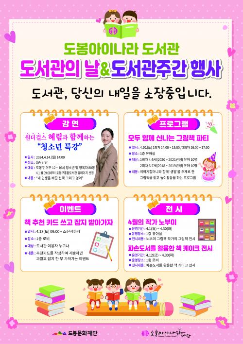 [½Åµ¿¾Æ¹æ¼Û µµºÀ±¸=À̽ŵ¿±âÀÚ]µµºÀ±¸µµºÀ¾ÆÀ̳ª¶óµµ¼­°üÀÌ µµ¼­°üÀdz¯‧µµ¼­°ü ÁÖ°£(4¿ù 13ÀÏ~20ÀÏ)À» ¸Â¾Æ ¡®µµ¼­°ü, ´ç½ÅÀÇ ³»ÀÏÀ» ¼ÒÀå ÁßÀÔ´Ï´Ù¡¯¶ó´Â ÁÖÁ¦·Î µ¶¼­ ¹®È­Çà»ç¸¦ ÁøÇàÇÑ´Ù. º» Çà»çÁÖ°£ µ¿¾È µµºÀ¾ÆÀ̳ª¶óµµ¼­°ü¿¡¼­´Â ¸í»ç ÃÊû, ¸ðµÎ ÇÔ²²¡¦