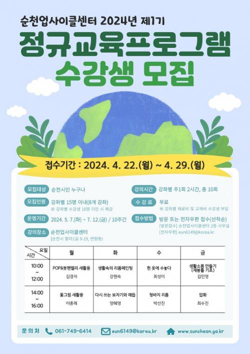 [½Åµ¿¾Æ¹æ¼Û ¼øÃµ=±è¿ëÈÆ ±âÀÚ] ¼øÃµ½Ã(½ÃÀå ³ë°ü±Ô)´Â ¼øÃµ½Ã ¾÷»çÀÌŬ¼¾ÅÍ ´õ»õ·Ò¿¡¼­ ¹ö·ÁÁö´Â ÀÚ¿øÀ» »õȰ¿ë°ú ÀçȰ¿ëÇÏ¿© »õ·Ó°Ô Àçź»ý½ÃŰ´Â ¹æ¹ýÀ» ¹è¿ï ¼ö ÀÖ´Â ¡¸2024³â Á¦1±â Á¤±Ô±³À°ÇÁ·Î±×·¥¡¹¼ö°­»ýÀ» 22ÀϺÎÅÍ ¼±Âø¼ø ¸ðÁýÇÑ´Ù°í ¹àÇû´Ù. À̹ø Á¤±Ô±³¡¦