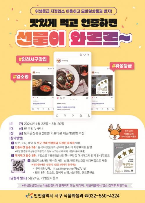 [½Åµ¿¾Æ¹æ¼Û ÀÎõ= À±¹Î½Ä±âÀÚ] ÀÎõ ¼­±¸ ±¸Ã»Àå °­¹ü¼®Àº ¡®À½½ÄÁ¡ À§»ýµî±ÞÁ¦¡¯¸¦ È«º¸Çϰí À§»ýµî±Þ ¿ì¼ö¾÷¼Ò·Î ÁöÁ¤µÈ À½½ÄÁ¡ÀÇ ÀÌ¿ëÀ» Àå·ÁÇϱâ À§ÇØ 4¿ù 22ÀϺÎÅÍ 5¿ù 20ÀϱîÁö ¼Ò¼È¹Ìµð¾î(SNS) ÀÎÁõ À̺¥Æ®¸¦ ½Ç½ÃÇÑ´Ù°í ¹àÇû´Ù. ¡®À½½ÄÁ¡ À§»ýµî±ÞÁ¦¡¯´Â¡¦