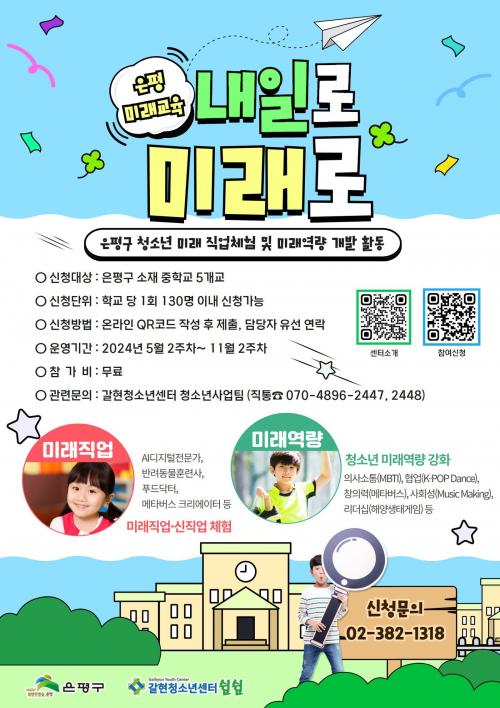 [½Åµ¿¾Æ¹æ¼Û ÀºÆò±¸=À̽ŵ¿±âÀÚ]ÀºÆò±¸´Â 2024³â ÀºÆò¹Ì·¡±³À°Áö±¸ ¸¶À»·Îµî±³ ¡®³»ÀÏ·Î ¹Ì·¡·Î¡¯ ½Å±Ô »ç¾÷À» °¥Çöû¼Ò³â¼¾ÅÍ¿¡¼­ ¿î¿µÇÑ´Ù°í ¹àÇû´Ù. ¡®³»ÀÏ·Î ¹Ì·¡·Î¡¯ ÇÁ·Î±×·¥Àº Çб³¿Í ¿¬°èÇØ Á¤ÇØÁø ³¯Â¥¿¡ Çб³ ´ë½Å °¥Çöû¼Ò³â¼¾ÅÍ·Î ¹æ¹®ÇØ ÁøÇàµÈ´Ù. ¹Ì·¡¡¦