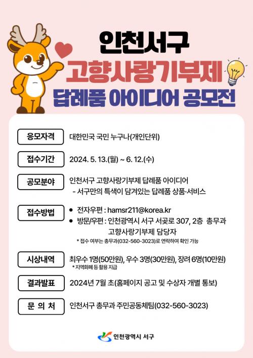 [½Åµ¿¾Æ¹æ¼Û ÀÎõ= À±¹Î½Ä±âÀÚ]ÀÎõ±¤¿ª½Ã ¼­±¸(±¸Ã»Àå °­¹ü¼®)´Â 5¿ù °¡Á¤ÀÇ ´ÞÀ» ¸ÂÀÌÇÏ¿© ¼­±¸¸¸ÀÇ Æ¯»öÀÖ°í ¿ì¼öÇÑ ´ä·ÊǰÀ» ¹ß±¼Çϱâ À§ÇØ ÀÎõ ¼­±¸ °íÇâ»ç¶û±âºÎÁ¦ ´ä·Êǰ ¾ÆÀ̵ð¾î °ø¸ðÀüÀ» °³ÃÖÇÑ´Ù°í ¹àÇû´Ù. °ø¸ðÁÖÁ¦´Â ¼­±¸¸¸ÀÇ Æ¯»öÀÌ ´ã°ÜÀÖ°í ǰÁú¡¦