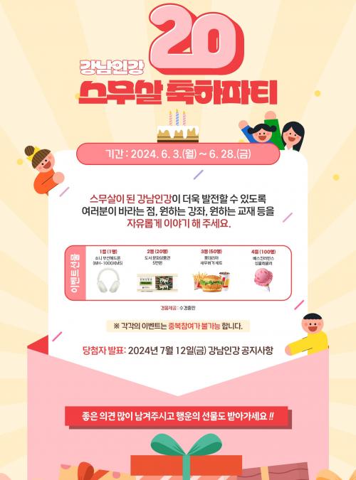 [½Åµ¿¾Æ¹æ¼Û °­³²±¸=À̽ŵ¿±âÀÚ]°­³²±¸°¡ ¿î¿µÇÏ´Â °­³²±¸Ã»ÀÎÅͳݼö´É¹æ¼Û(ÀÌÇÏ °­³²Àΰ­)ÀÌ 20ÁÖ³âÀ» ¸Â¾Æ 6¿ù ÇÑ ´Þ°£ ÃàÇÏ À̺¥Æ®¸¦ °³ÃÖÇÑ´Ù. °­³²Àΰ­ ½º¹«»ì ÃàÇÏÆÄÆ¼ 20ÁÖ³â Æ¯º° °¡ÀÔ À̺¥Æ®, ¸ÞŸ¹ö½º À̺¥Æ® µî 3°³ À̺¥Æ®¸¦ µ¿½Ã ÁøÇàÇϰí ǪÁüÇÑ °æÇ°À» Á¦¡¦