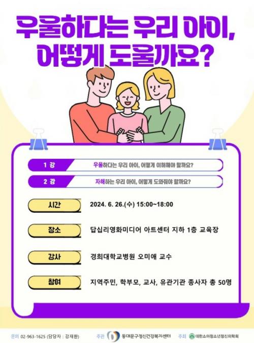 [½Åµ¿¾Æ¹æ¼Û µ¿´ë¹®±¸=À̽ŵ¿±âÀÚ]¼­¿ï µ¿´ë¹®±¸°¡ 6. 26.(¼ö) ´ä½Ê¸®¿µÈ­¹Ìµð¾î¾ÆÆ®¼¾ÅÍ ÁöÇÏ 1Ãþ ±³À°Àå¿¡¼­ ¡®¾Æµ¿ ․ û¼Ò³â ¿ì¿ïÁõ¿¡ ´ëÇÑ ÀÌÇØ¿Í À§±â»óȲ ´ëó¹ý¡¯À» ÁÖÁ¦·Î °ø°³°­Á¸¦ °³ÃÖÇÑ´Ù. µ¿´ë¹®±¸Á¤½Å°Ç°­º¹Áö¼¾ÅͰ¡ ÁÖ°üÇÏ°í ´ëÇѼҾÆÃ»¼Ò³âÁ¤¡¦